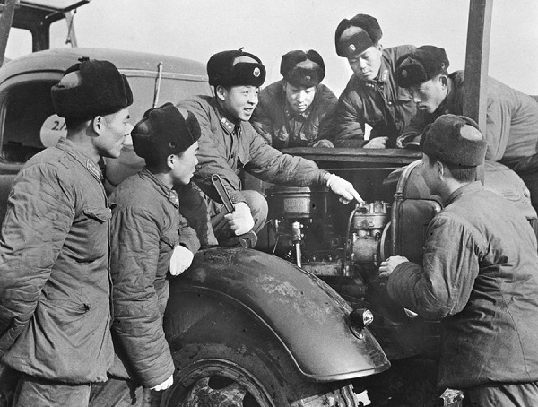 雷锋同志是艰苦奋斗的模范,勤俭节约的标兵。这是他在向战友们介绍节约油料和安全行车的经验。新华社图片